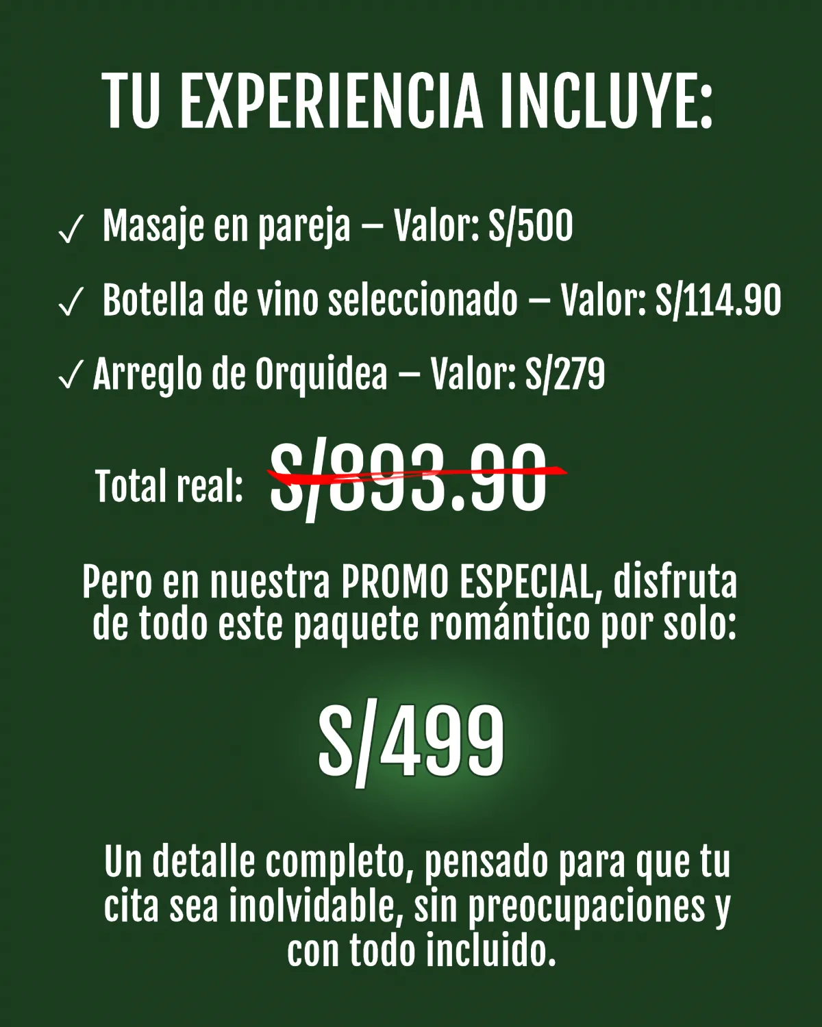 La promoción incluye un masaje en pareja (valor regular S/500), una botella de vino seleccionado (valor S/114.90) y un arreglo de orquideas (valor S/279). Todo el paquete, que normalmente costaría S/893.90, lo obtienes por solo S/499.
